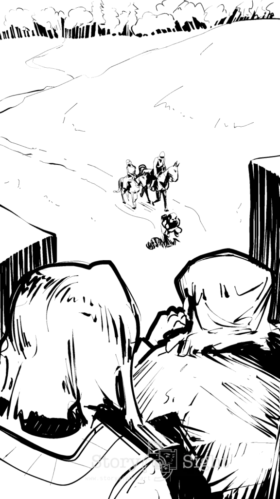 One said to the others, “Do you see those two? A knight and a lady, very fair and well dressed? Their horses are not bad either. Allow me the honor. I will attack the knight. First. His armor will be mine.”