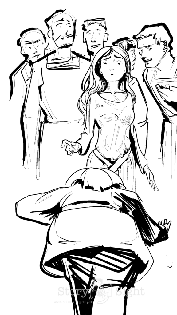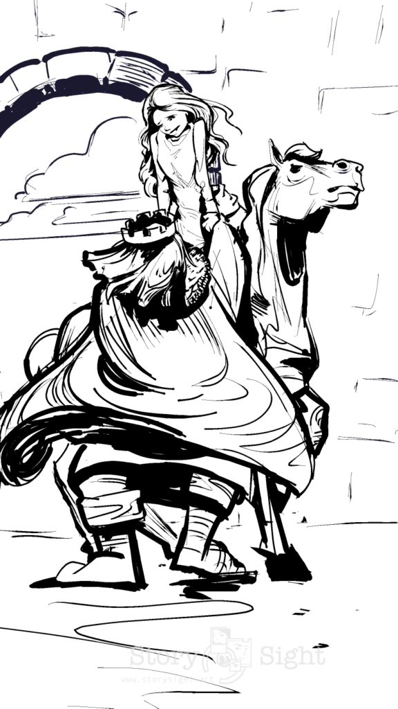 Enide meets the hasty lad upon the step, the boy knows well when he sees the start of a story. He bows to her and conveys her lord’s command. Enide listens in surprise. The knights who attend her, urge her to make haste, they wish to see their lord in arms again. Thus Enide enters the courtyard beautiful, cheerful, not a trace of tears. She knows well how she ought to seem. Erec looks on her and his anger falters. “Lady…” he says, and hearing him her heart beats faster. He heeds not his knights as they urge him to command them, his thoughts are for her alone. She offers up a hopeful smile, but Erec scowls and turns away in anger.