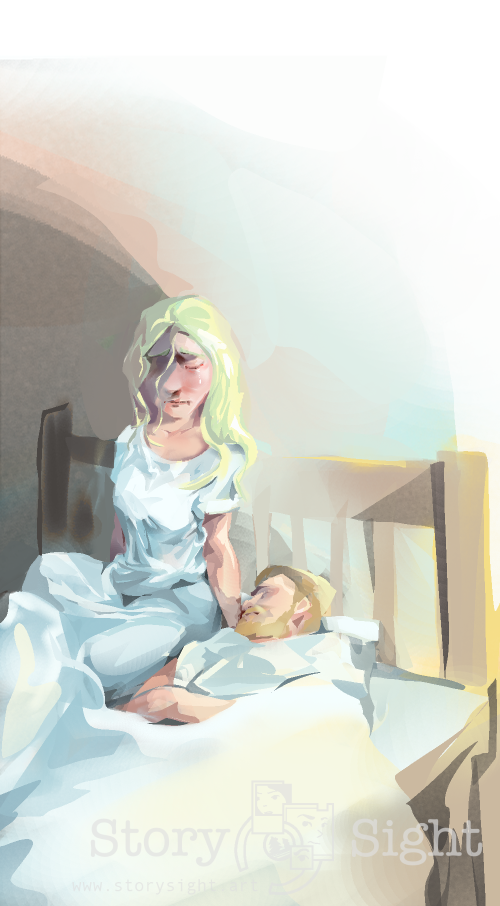 Now Erec stirs at her sound and seeing his pretty one in tears, he puts his arms about her, strokes her hair and wishes to know the secret of her grief. Enide tries to put him off, she protests, “It’s nothing!” And wipes away the tears. Now Erec presses her, he will not be denied.