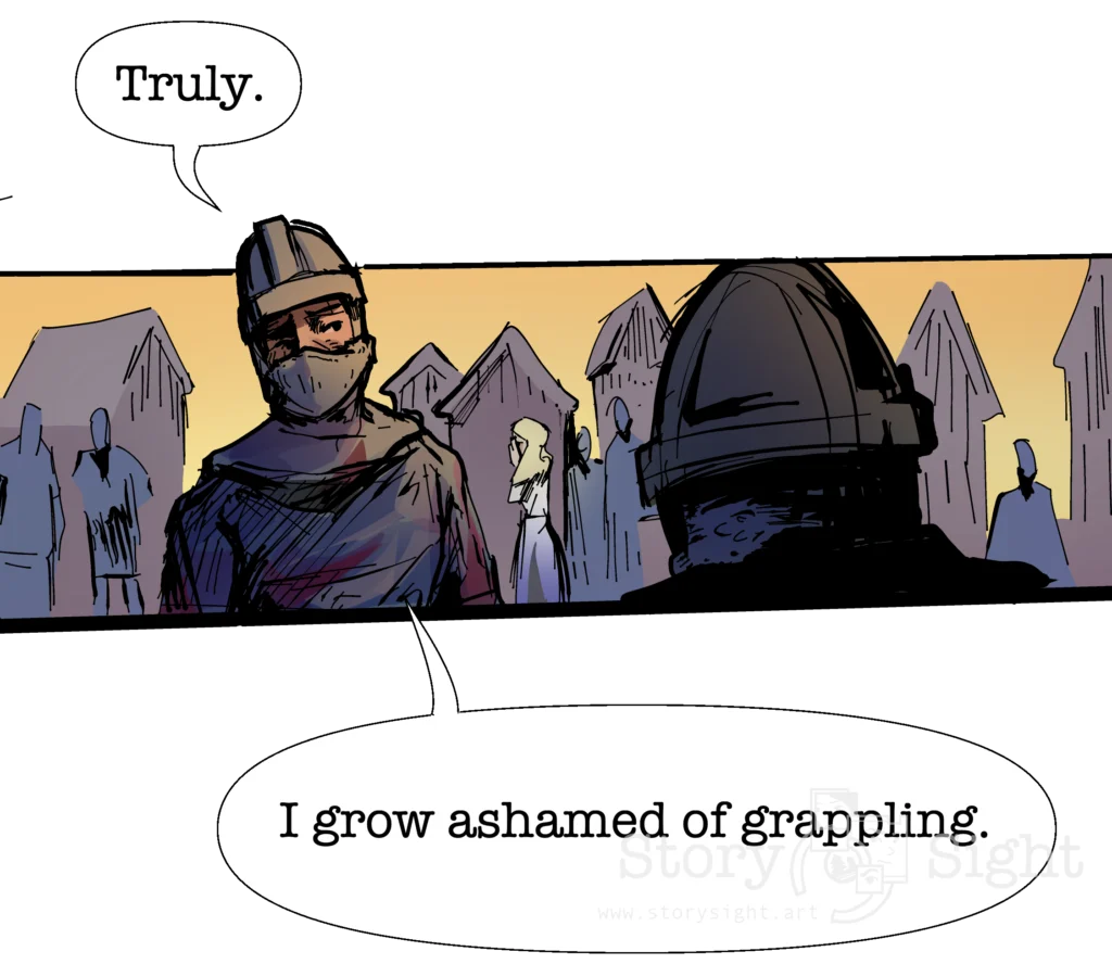 At last Erec’s foe struggles free of this burdensome embrace “Wait!” Shouts the knight, “Let us rest a moment. These blows we deal are far too weak. Do you feel no shame to fight so sluggishly before your lady! Let us rest!”